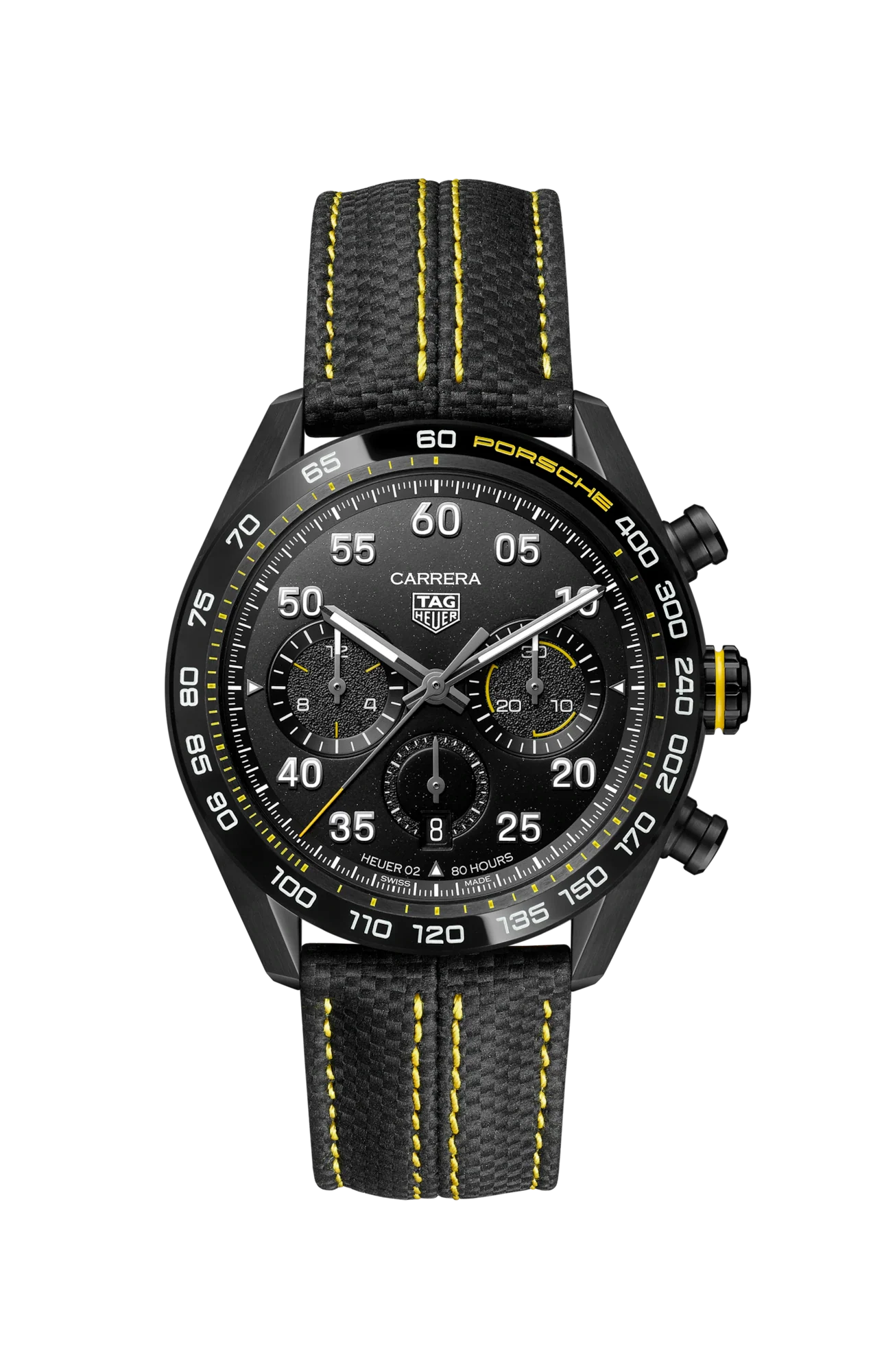 Born from an iconic partnership between two Maisons, the TAG Heuer Carrera Porsche Limited Edition embodies innovation, prestige and striking luxury. With its daring look, the distinctive shiny black dial draws inspiration from Porsche’s distinctive bodywork.