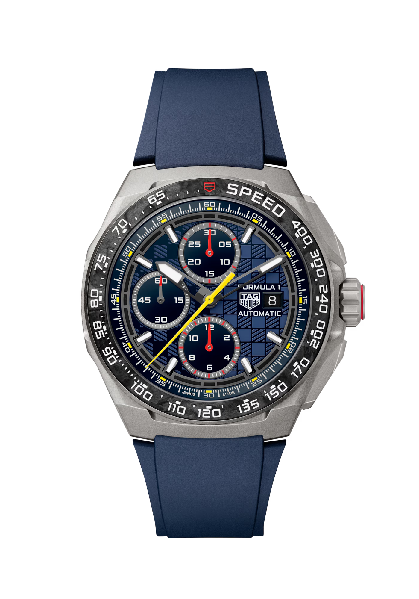 Designed for the daring, the TAG Heuer Formula 1 Chronograph in 44mm brings the spirit of racing to the wrist. The titanium grade 2 case, red accents, and rugged rubber strap create a timepiece ready for any challenge.