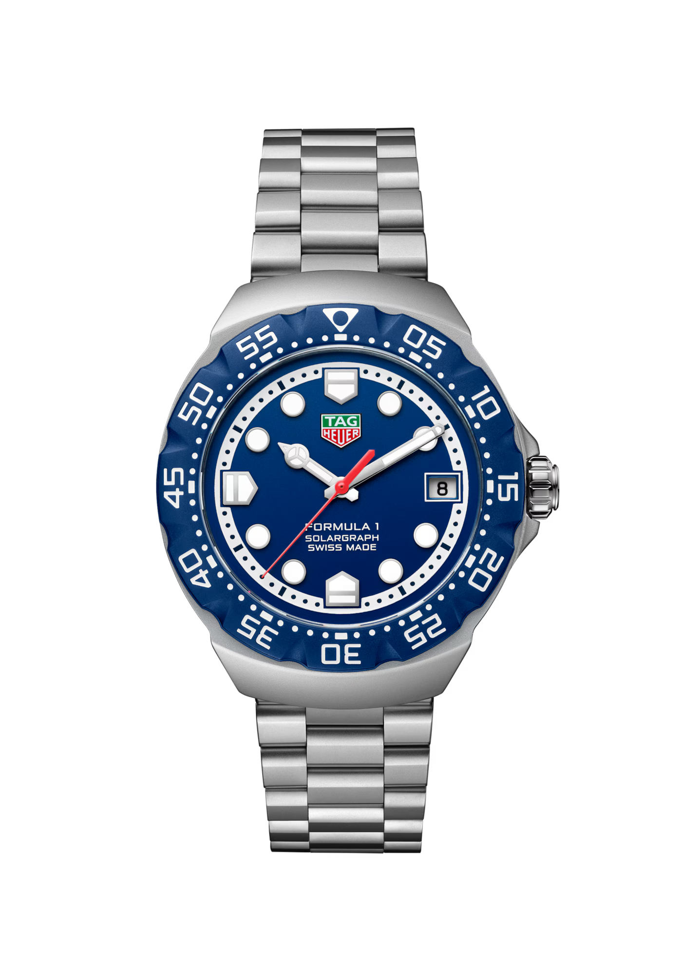 Inspired by the original Series 1 watch, the TAG Heuer Formula 1 Solargraph in 38mm expands the energetic aesthetic with a vibrant blue dial and sleek design. Combining a playful style with functionality, this solar-powered timepiece is made for trendsetters who value both style and innovation.