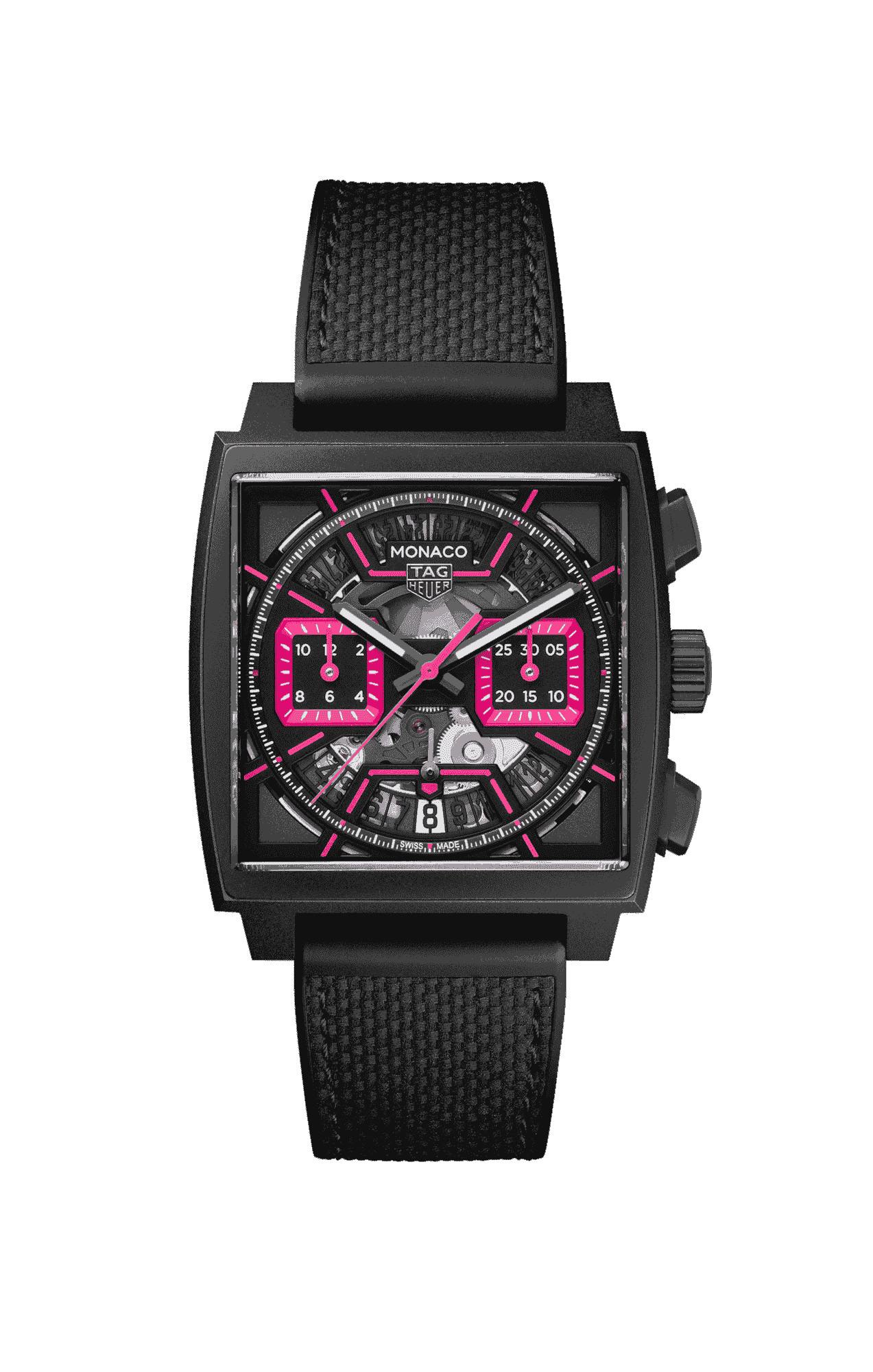 Step into a world of bold innovation with this avant-garde TAG Heuer Monaco. A contemporary twist on a classic, this timepiece melds vibrant pink with sleek black in a striking skeleton design, embodying the daring spirit of today's trailblazers.