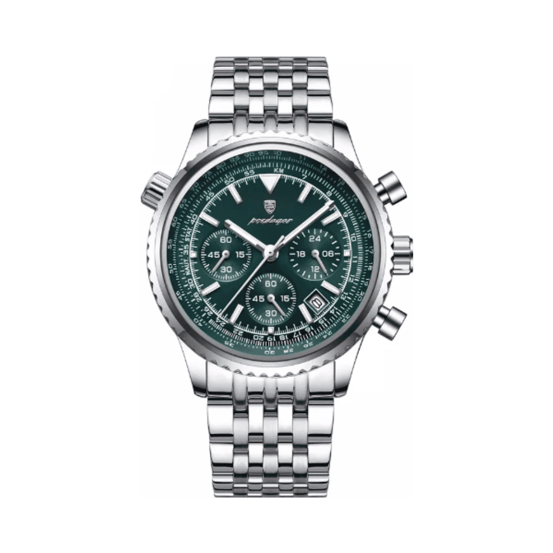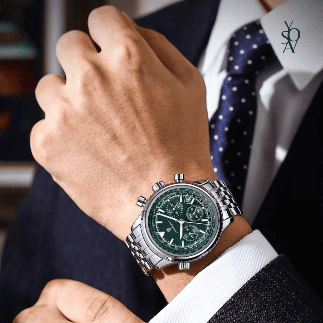 Discover timeless elegance with our exquisite chronograph timepiece. Featuring a stunning green dial and intricate chronograph functions, this watch is perfect for those who appreciate precision and style. Its robust stainless steel bracelet ensures durability and complements any outfit, making it a versatile addition to your collection. Experience unparalleled craftsmanship and sophistication with every ticking second.