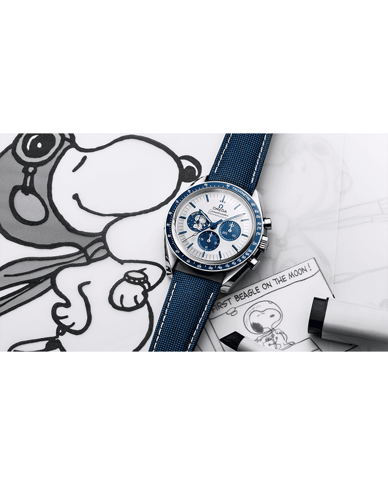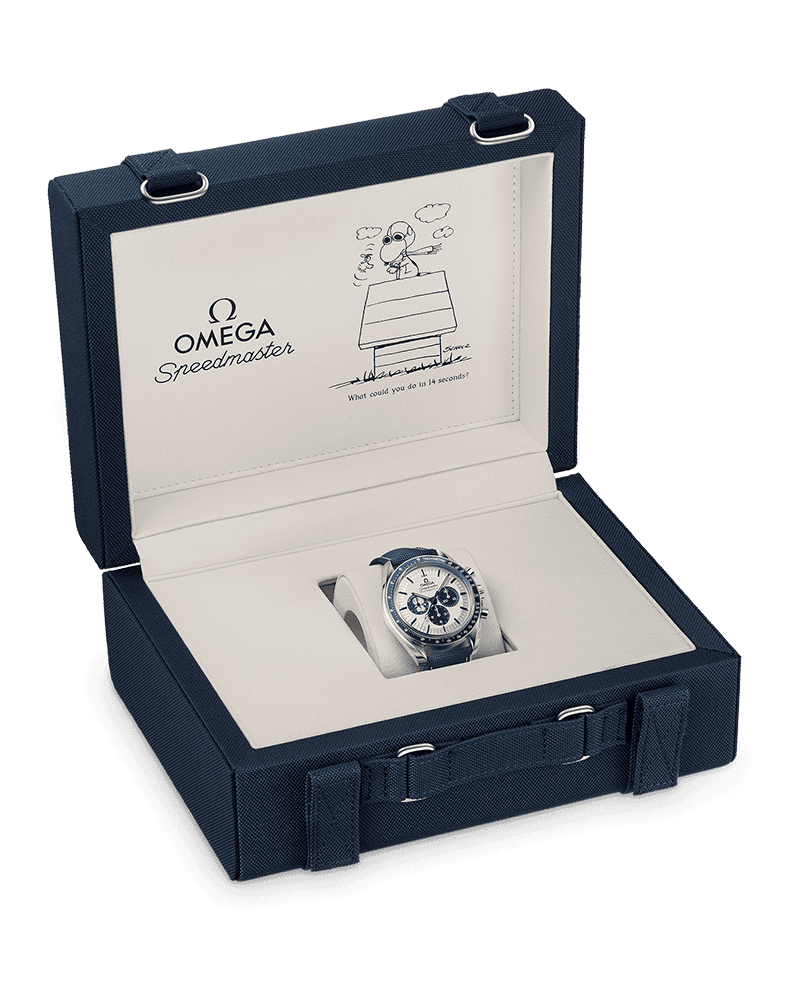 On the caseback, Snoopy appears on the Service Module (CSM) as a magic hand. When the chronograph is activated, it travels towards the Moon, decorated on the sapphire crystal. An Earth disc also rotates once per minute, synchronized with the small seconds hand.